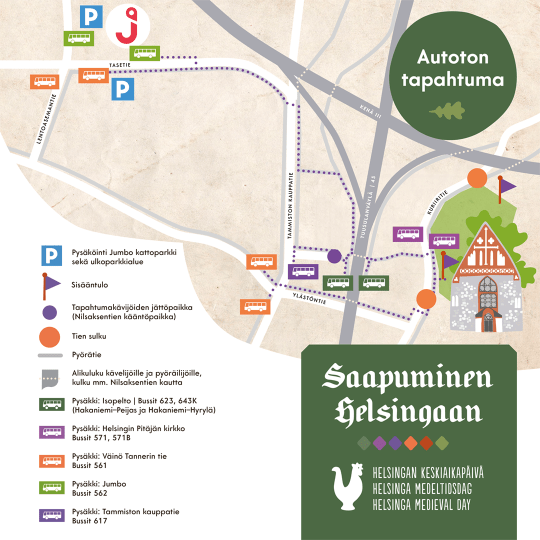 Helsingan keskiaikapäivä järjestetään Helsingin pitäjän kirkonkylässä Vantaalla (Kirkkotie 45). Valtaisan suosion saavuttanut tapahtuma on parkkitilan rajallisuudesta ja turvallisuussyistä tänä vuonna autoton. Suosittelemme saapumista julkisen liikenteen kulkuvälineillä, polkupyörillä ja kävellen. Yksityisautoille ei ole tapahtuma-alueella parkkipaikkoja, inva-parkkipaikkoja on käytössä rajallinen määrä. Pyörille on varattu runsaasti pyöräparkkitilaa alueen molempiin päätyihin.